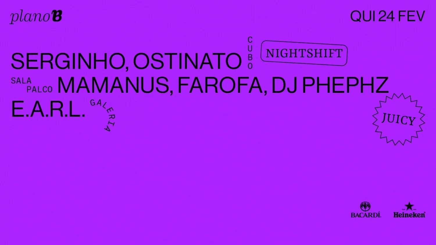 Nightshift & Juicy – Plano B Cubo: Serginho, Ostinato Palco: Mamanus, Farofa, DJ Phephz Galeria: E.A.R.L. Nightshift & Juicy – Plano B Data 24 Fev 2022 Desde Hora 22:00 Localização Plano B Rua Cândido dos Reis nº30 4050-150 Porto Website https://agendaculturalporto.org/agenda-plano-b-porto/ Categorias Clubbing | NightlifeConcertos / MúsicaEventos ao Fim de semana Share this event Newsletter Receba comodamente no seu Email os eventos mais relevantes da cidade do Porto. Deixe este campo vazio se for humano: