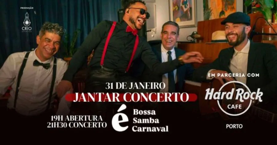 O Hard Rock Cafe Porto recebe no dia 30 de janeiro, das 19h00 às 23h30, a Noite É Bossa – Jantar Concerto, uma viagem pelos anos de ouro da Música Popular Brasileira (MPB).
