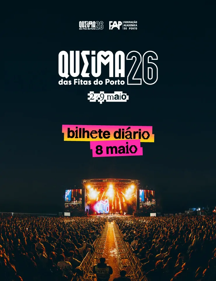 📅 Data: Sexta-feira, 8 de maio de 2026 ⏰ Hora: 20h00 (abertura de portas) ⏳ Duração: 10 horas 📍 Local: Queimódromo do Porto 👥 Classificação etária: Maiores de 16 anos 🎟️ Bilhete: Pago 🎓 Promotor: Federação Académica do Porto