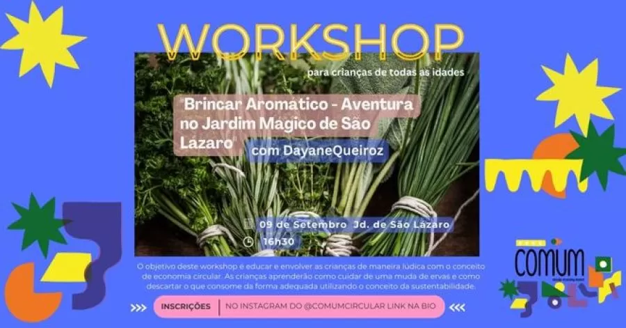 Brincar Aromático – Aventura no Jardim Mágico de São Lázaro” O objetivo deste workshop é educar e envolver as crianças de maneira lúdica com o conceito de economia circular. As crianças aprenderão como cuidar de uma muda de ervas e como descartar o que consome da forma adequada utilizando o conceito da sustentabilidade (faremos uma pequena gincana). Além disso, elas poderão levar para casa suas próprias mudas de ervas e vasos personalizados como lembranças.(para todas as idades) Inscrições pelo link na bio do Instagram @comumcircular ou através deste link: https://forms.gle/TLNXw4wYbMBGEgGc9