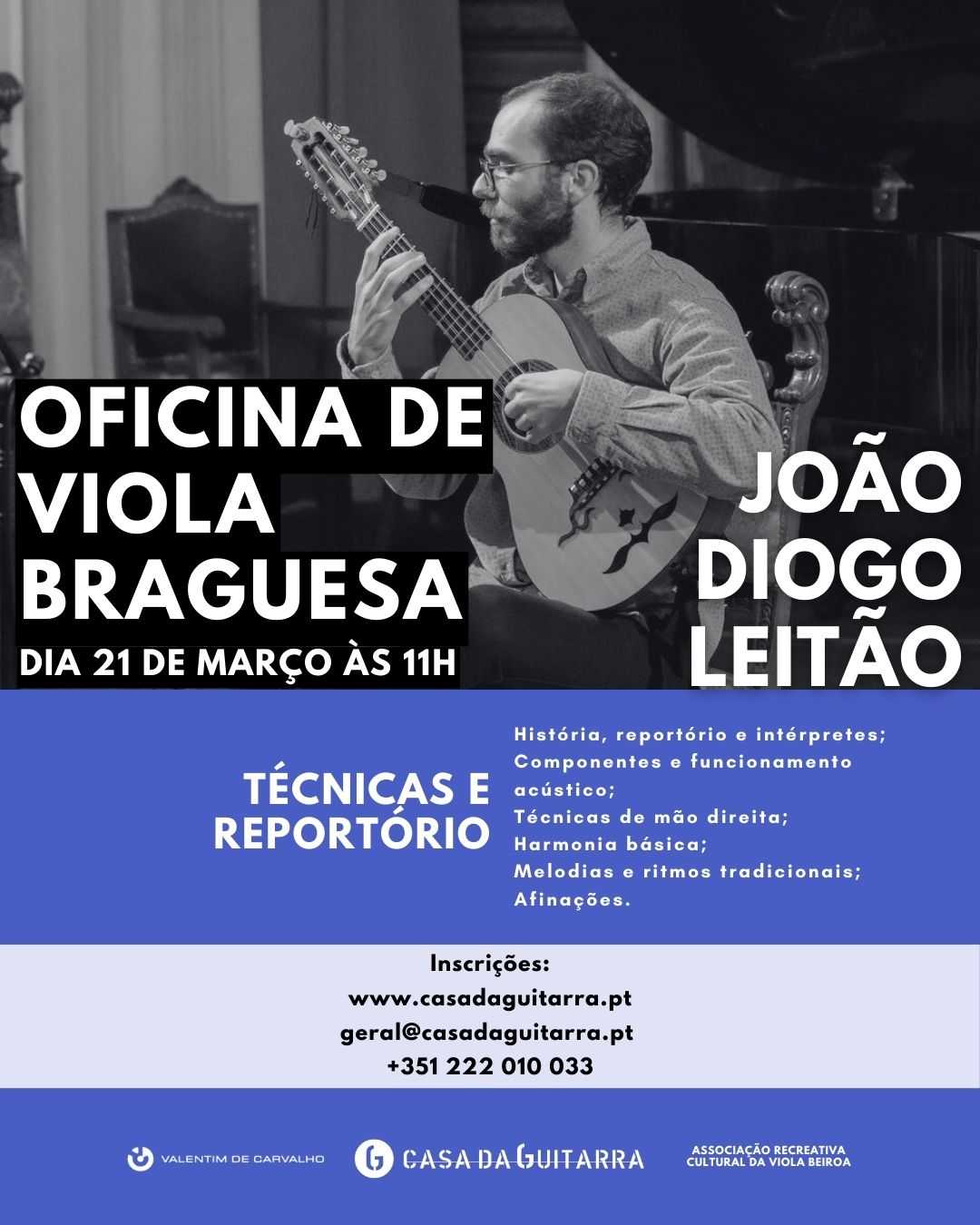 Dia 21 de março, pelas 11 horas, a Casa da Guitarra recebe uma oficina de Viola Braguesa, orientada por João Diogo Leitão – músico e investigador dedicado à prática, estudo e divulgação das violas tradicionais portuguesas, com particular enfoque na viola braguesa.