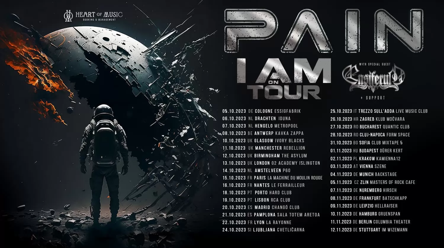 Após uma espera de seis anos, os suecos Pain estão de volta à Europa com a sua tour “I AM” que passará em 17 países incluindo Portugal. A acompanhar a banda de Peter Tägtgren nesta digressão vão estar também os seus convidados especiais Ensiferum . A banda de folkmetal da Finlândia estará de regresso também a Portugal. Os concertos vão realizar-se nos dias 18 de Outubro na Cidade do Porto no Hard Club, e no dia 19 em Lisboa no RCA Club.