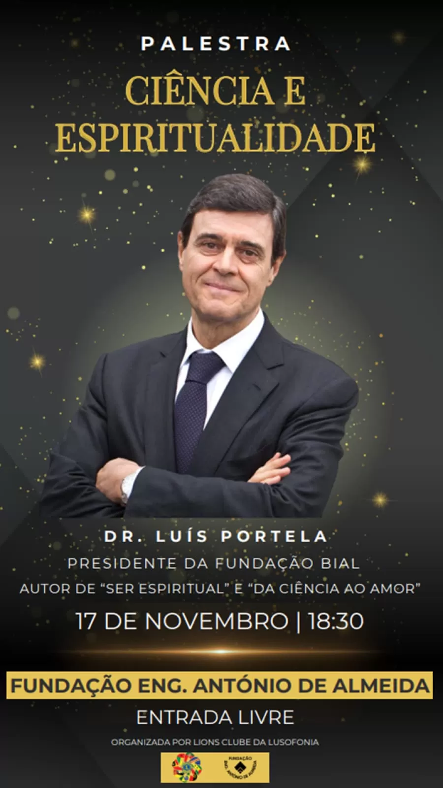 O Lions Clube da Lusofonia, organiza a palestra “CIÊNCIA E ESPIRITUALIDADE”, proferida pelo Doutor Luís Portela, Presidente da Fundação BIAL, no dia 17 de novembro às 18:30h, na Fundação Engº António de Almeida, na Rua Tenente Valadim, 231/ 325. 4100-479 Porto. É uma oportunidade rara de se poder ouvir este excelente orador, autor de obras como “Ser espiritual” e “Da Ciência ao Amor”.