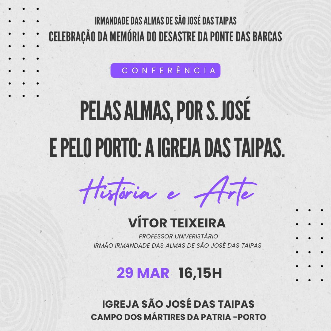 Pelas Almas, por S. José e pelo Porto: A Igreja das Taipas Pelas Almas, por S. José e pelo Porto: A Igreja das Taipas + Adicionar ao Google Calendar Data 29 Mar 2026 Hora 16:15 - 17:15 Localização Igreja de São José das Taipas Campo dos Mártires da Pátria 179, 4050-091 Porto Categorias ConferênciaEventos ao Fim de semana Share this event Newsletter Receba comodamente no seu Email os eventos mais relevantes da cidade do Porto. Deixe este campo vazio se for humano: