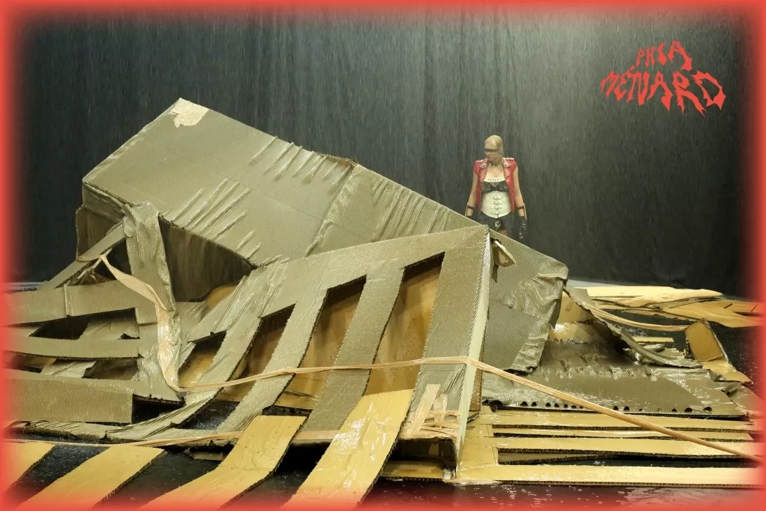 Um gesto simples, repetitivo, como um robô. Espalhar, traçar, cortar, montar, colocar no sítio, depois começar tudo de novo. Parece estar tudo perfeito, excetuando aquela nuvem, que parece estar a ficar maior, mais espessa e mais escura. Talvez um raio de luz, uma brisa suave, depois chuva forte a dado momento, um aguaceiro, talvez mesmo uma tempestade com torrentes de água! A aldeia Marshall colapsa, apesar da energia despendida a tentar salvá-la. Fica em papa, uma trapalhada pegajosa em que se afogam corpos… – Phia Ménard