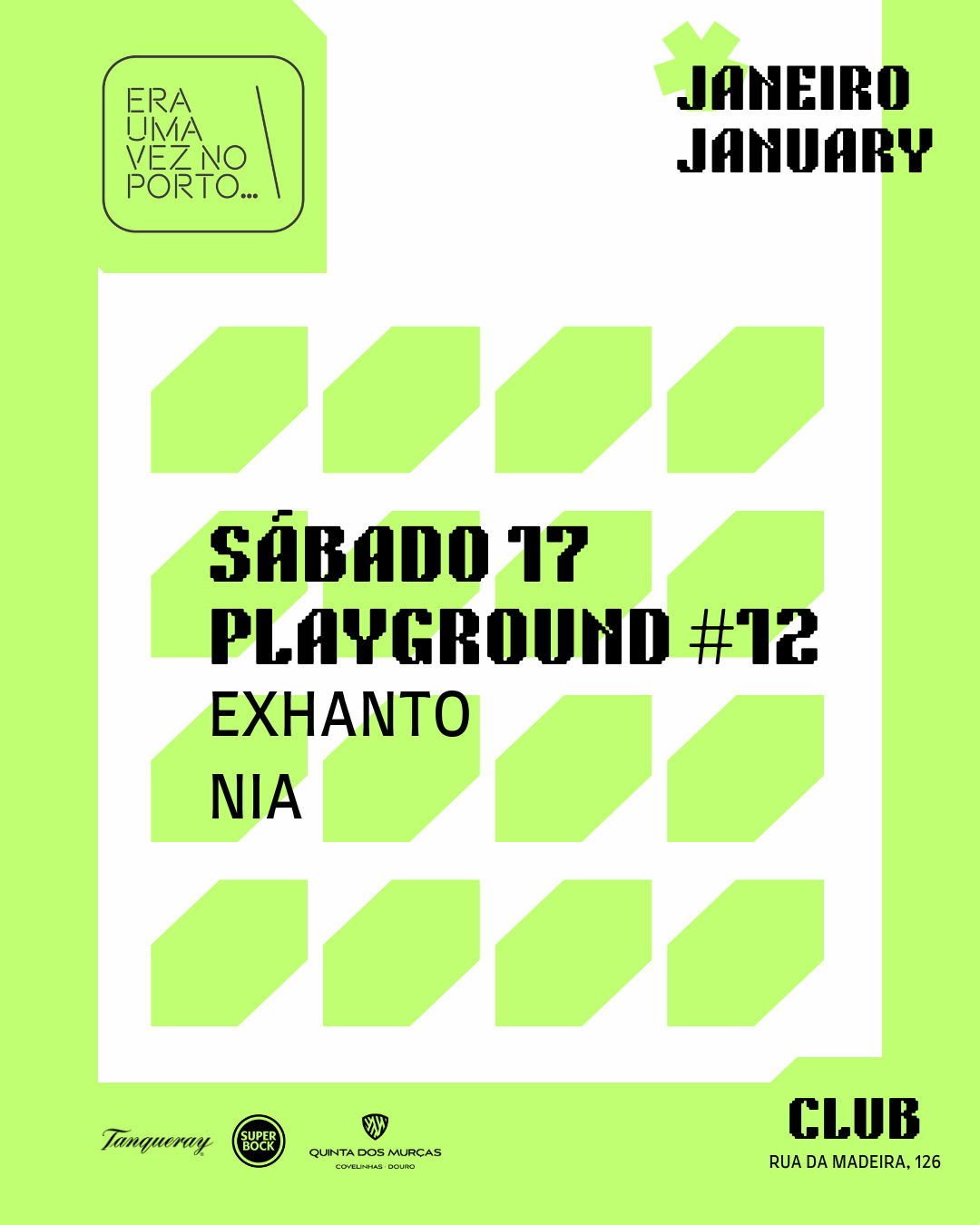 PLAYGROUND #12 by Funk Productions … Sábado, 17|01|2026 Funk Productions presents PLAYGROUND #12 🎧 Exhanto 🎧 Nia . . + Adicionar ao Google Calendar Data 17 - 18 Jan 2026 Hora 23:55 - 6:00 Localização Era uma vez no Porto R. da Madeira 126, 4000-330 Porto Categorias Clubbing | NightlifeEnglish-Friendly EventsEventos ao Fim de semana Share this event Newsletter Receba comodamente no seu Email os eventos mais relevantes da cidade do Porto. Deixe este campo vazio se for humano: