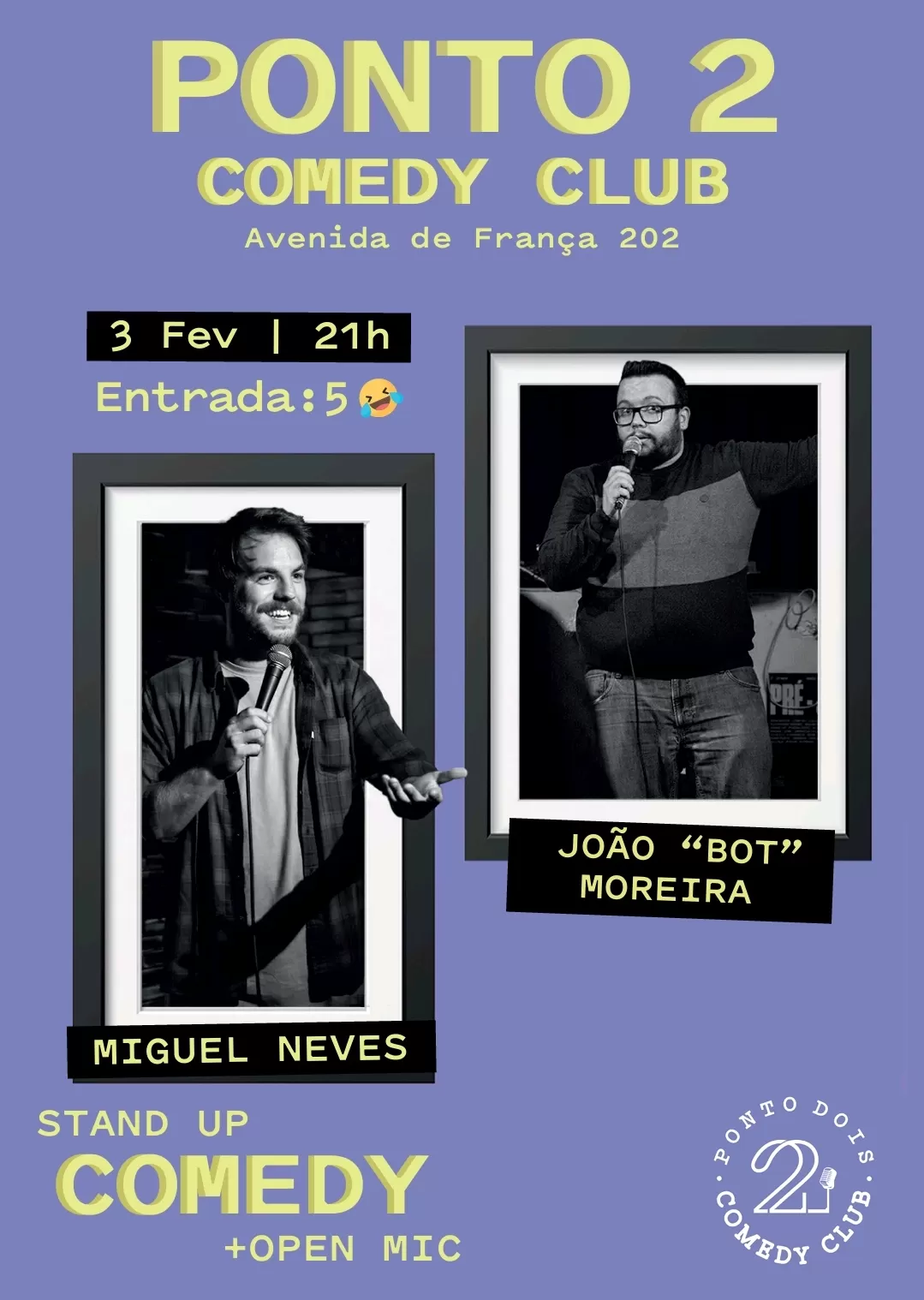 Ponto 2 Stand-Up Comedy Night 03/fev Ponto 2 Stand-Up Comedy Night 03/fev Data 03 Fev 2023 Desde Hora 21:00 - 22:30 Localização Ponto 2 Avenida de França 202, Porto Categorias Eventos ao Fim de semanaPerformanceStand up Comedy Share this event Newsletter Receba comodamente no seu Email os eventos mais relevantes da cidade do Porto. Deixe este campo vazio se for humano: