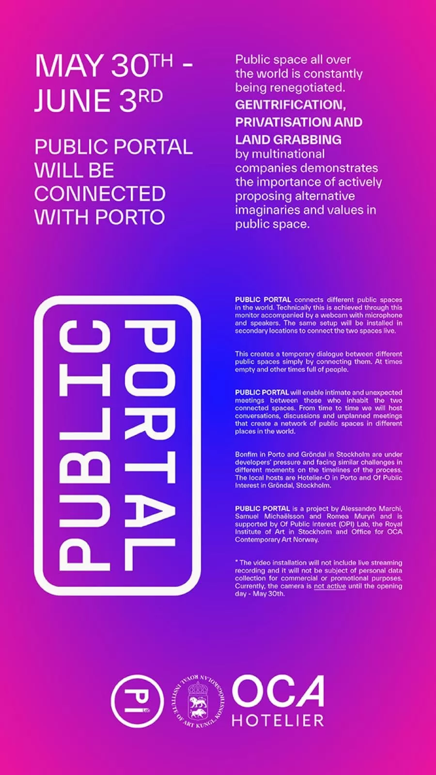 O Hotelier vai receber entre 30 de maio e 3 de junho, o Public Portal, que com a colaboração do Royal Institute of Art in Stockholm fará uma intervenção na montra do hotelier, onde se criará um canal de comunicação entre diferentes públicos e espaços públicos – desenvolvendo uma estratégia artística e uma plataforma inovadora para o discurso crítico sobre a construção, significado e importância do espaço público. O espaço público em todo o mundo está sendo constantemente renegociado. Gentrificação, privatização, grilagem de terras por empresas multinacionais e deslocamento de artistas e outros grupos marginalizados demonstram a importância de participar ativamente na proposição de imaginários e valores alternativos no espaço público. Public Portal visa conectar diferentes espaços públicos no mundo. Tecnicamente isso é feito por meio de um monitor instalado na porta vazia do OPI Lab, acompanhado de uma webcam com microfone e alto-falantes. A mesma configuração será instalada em locais secundários para conectar dois espaços ao vivo. Neste momento estamos a trabalhar na criação de um Portal Público no Porto e também em Stavanger. Isso cria uma conexão mágica e um diálogo entre diferentes espaços públicos simplesmente olhando um para o outro. Às vezes vazio e às vezes cheio de gente. Between May 30th and June 3rd, the Hotelier will receive the Public Portal, which, in collaboration with the Royal Institute of Art in Stockholm, will carry out an intervention in the hotelier’s window, where a communication channel will be created between different audiences and public spaces – developing an artistic strategy and an innovative platform for critical discourse on the construction, meaning and importance of public space. Public space all over the world is constantly being renegotiated. Gentrification, privatisation, land grabbing by multinational companies and displacement of artists and other marginalised groups demonstrates the importance of taking an active part in proposing alternative imaginaries and values in public space. Public Portal aims to connect different public spaces in the world. Technically this is achieved through a monitor installed in the vacant door at OPI Lab, accompanied by a webcam with microphone and speakers. The same setup will be installed in secondary locations to connect two spaces live. We are currently working on setting up a Public Portal in Porto and also one in Stavanger. This creates a magical connection and dialogue between different public spaces simply looking at each other. At times empty and other times full of people.