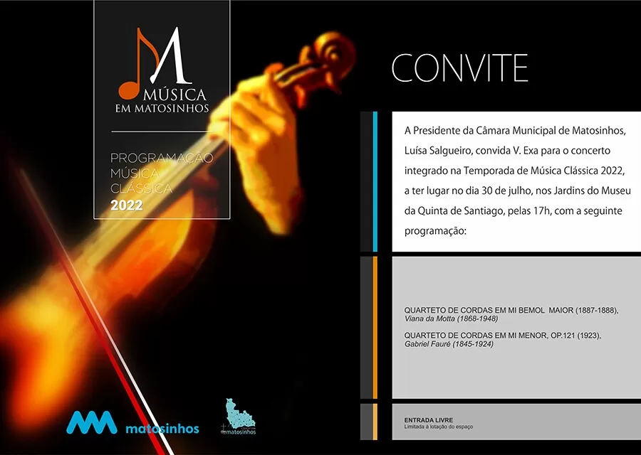 Quarteto de Cordas de Matosinhos Quarteto de Cordas de Matosinhos Programação Música Clássica 2022 Horário: 17h Museu Quinta de Santiago Data 30 Jul 2022 Desde Hora 17:00 Localização Museu da Quinta de Santiago Leça da Palmeira Categorias Concertos / MúsicaEventos ao Fim de semanaEventos Gratuitos Share this event Newsletter Receba comodamente no seu Email os eventos mais relevantes da cidade do Porto. Deixe este campo vazio se for humano: