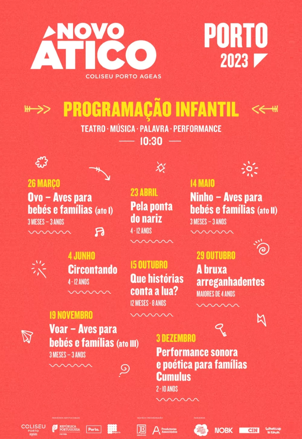 Teatro, música, palavra e performance. A programação infantil do NOVO ÁTICO é para toda a família, pensada para despertar a curiosidade e sensibilidade dos bebés e crianças. Ao longo do ano, ao domingo de manhã, este é um programa que não vai querer perder!