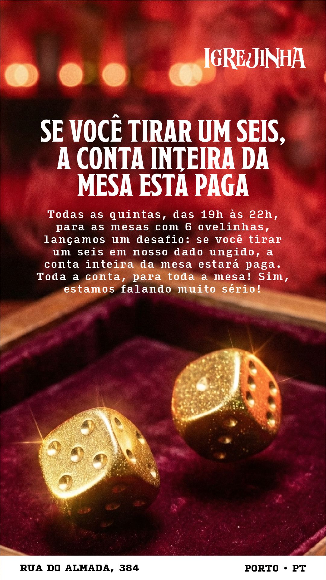 Sim ovelinha, você leu certo! Aqui na Sua Santa Parada no Porto, a sua sorte é quem manda na conta. O nosso Dado Ungido está pronto para ser lançado e ele pode zerar o consumo da tua mesa!