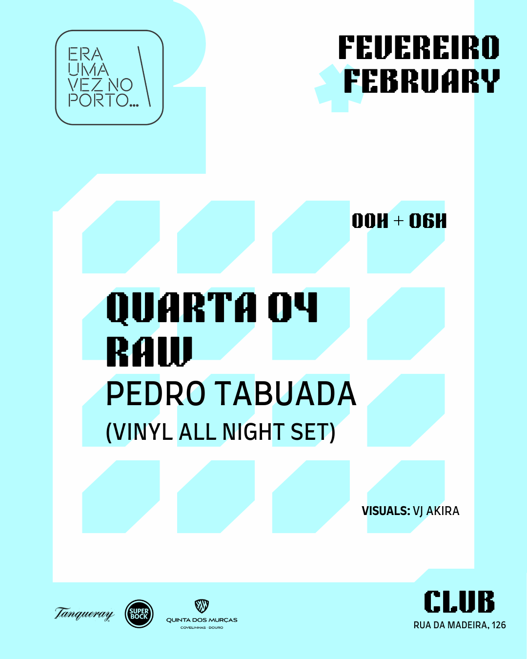 R4W … Quarta-feira, 04|02|2026 R4W 23h59/6h 🎧 Pedro Tabuada (vinyl all night set) 🎬 VJ Akira . . + Adicionar ao Google Calendar Data 04 - 05 Fev 2026 Hora 23:55 - 6:00 Localização Era uma vez no Porto R. da Madeira 126, 4000-330 Porto Categorias Clubbing | NightlifeEnglish-Friendly Events Share this event Newsletter Receba comodamente no seu Email os eventos mais relevantes da cidade do Porto. Deixe este campo vazio se for humano:
