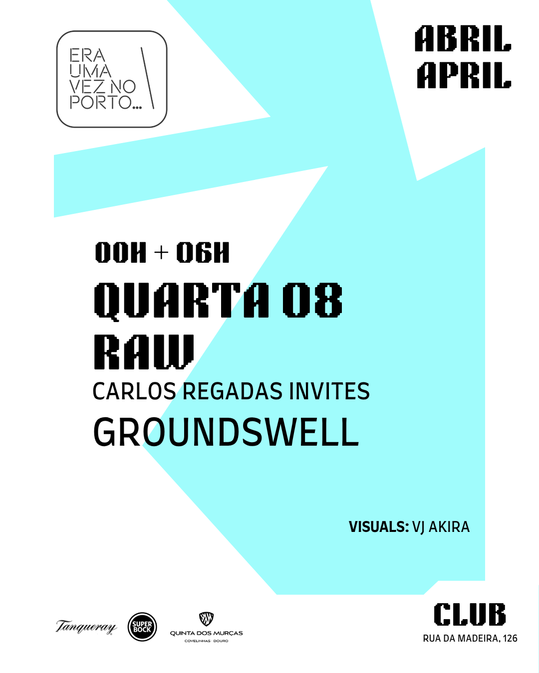 R4W … Quarta-feira, 08/04/2026 23h59/6h00 R4W 🎧 Carlos Regadas invites 🎧 Groundswell 🎬 VJ Akira . . + Adicionar ao Google Calendar Data 08 - 09 Abr 2026 Hora 23:55 - 6:00 Localização Era uma vez no Porto R. da Madeira 126, 4000-330 Porto Categorias Clubbing | NightlifeEnglish-Friendly Events Share this event Newsletter Receba comodamente no seu Email os eventos mais relevantes da cidade do Porto. Deixe este campo vazio se for humano: