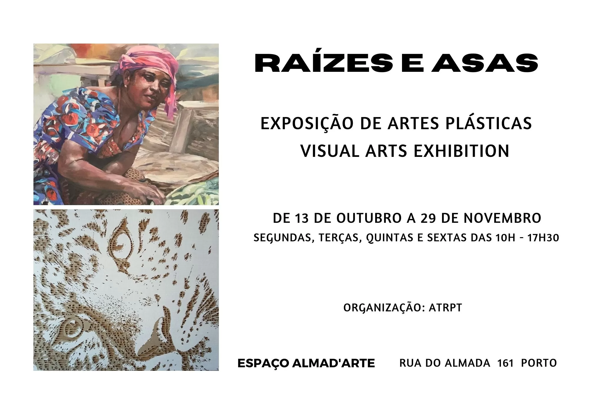 O Espaço Almad’Arte apresenta a exposição de artes plásticas Raízes e Asas, que reúne trabalhos de pintura inspirada nas raízes africanas de Manuela Mota, e trabalhos realizados na técnica de “card carving”, através da qual Zachy Santos representa o mundo, “sobre cartão, porque nada dura para sempre”, apesar de tentarmos dar asas a esse sonho.