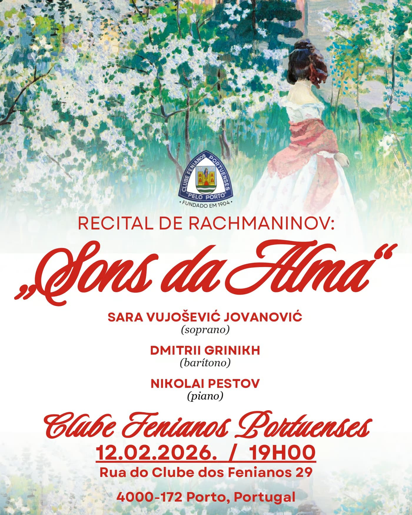No dia 12 de fevereiro de 2026, o Clube Fenianos Portuenses, no Porto, acolhe o recital “Sons da Alma”, um concerto de música clássica que explora a intensa expressividade de Sergei Rachmaninov através de romances para voz e piano e prelúdios para piano solo, obras escritas entre o final do século XIX e início do século XX antes do compositor entrar em exílio voluntário após a Revolução Bolchevique.
