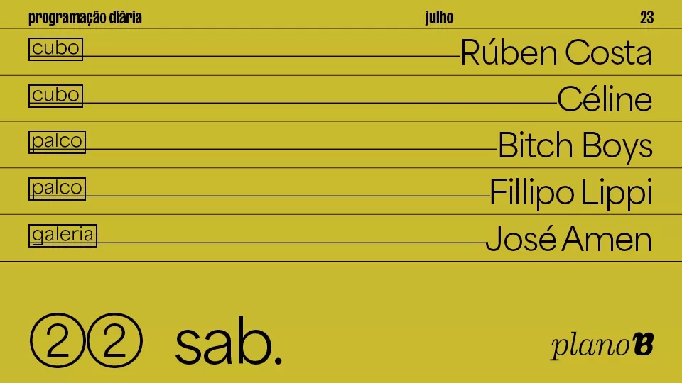 Rúben Costa, Céline, Bitch Boys, Fillipo Lippi, José Amen Rúben Costa, Céline, Bitch Boys, Fillipo Lippi, José Amen – Plano B Data 22 Jul 2023 Desde Hora 22:00 Localização Plano B Rua Cândido dos Reis nº30 4050-150 Porto Website https://agendaculturalporto.org/agenda-plano-b-porto/ Categorias Clubbing | NightlifeConcertos / MúsicaEventos ao Fim de semana Share this event Newsletter Receba comodamente no seu Email os eventos mais relevantes da cidade do Porto. Deixe este campo vazio se for humano: