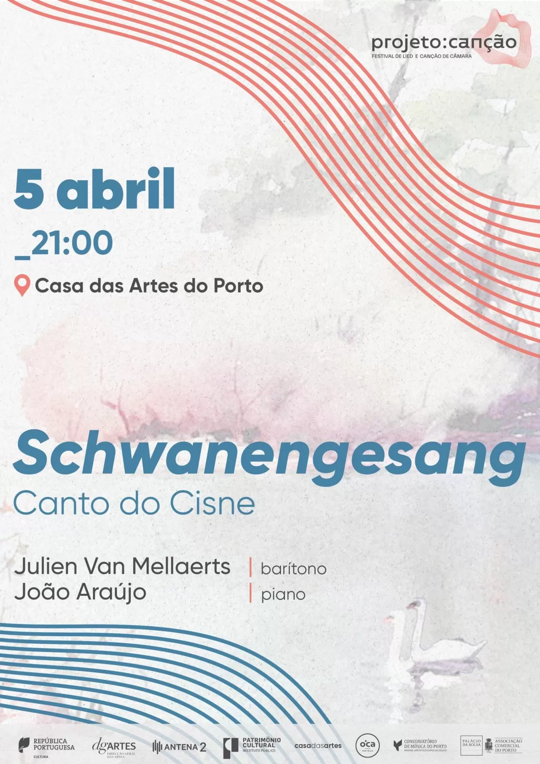 Schwanengesang ~ Canto do Cisne Na sexta-feira à noite, o Projeto:Canção conta com o barítono neozelandês Julian van Mellaerts e o pianista João Araújo para interpretarem as derradeiras canções de Franz Schubert, compostas nos seus últimos meses de vida e agrupadas no ciclo Schwanengesang (ou “Canto do Cisne” na tradução para português). Com poesia de Rellstab, Heine e Seidl, esta seleção de canções destaca-se por se afastar do formato cíclico das duas anteriores, configurando-se antes como uma coletânea que abraça toda a riqueza poética e musical dos últimos momentos da vida criativa de Schubert. O programa inclui ainda o ciclo “The Lake” da compositora britânica Errollyn Wallen, consistindo numa reflexão e reacção à obra de Schubert. Julien Van Mellaerts é um dos mais bem-sucedidos barítonos da sua geração, tendo conquistado prémios nalguns dos mais prestigiados concursos de canção, tais como Wigmore Hall Competition for Art Song (Reino Unido) e Concours Musical International de Montréal (Canadá). João Araújo é pianista acompanhador na Universidade de Aveiro. Foi laureado com o prémio de Melhor Pianista no Concurso Internacional de Montreal no Canadá e no concurso Maureen Lehane no Wigmore Hall em Londres e colabora com vários cantores em diversos festivais internacionais.