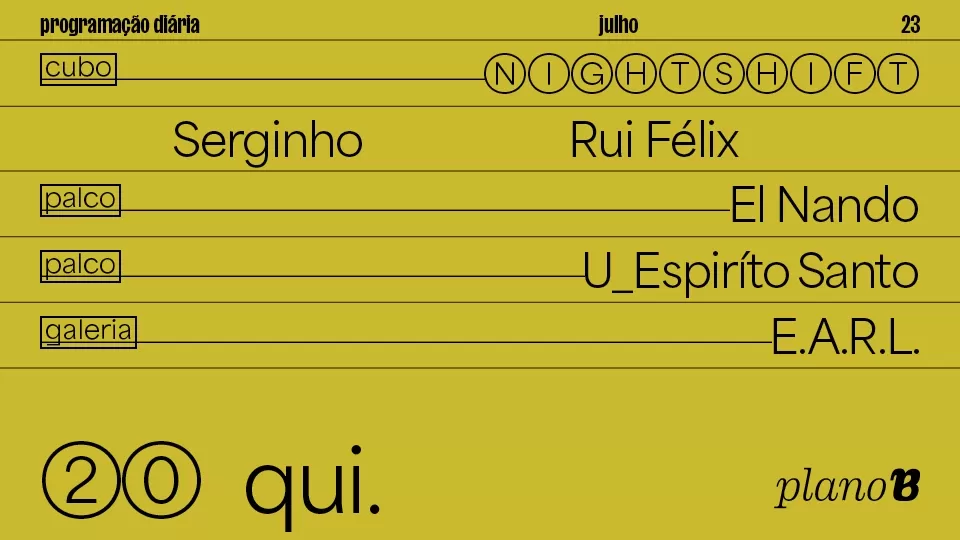 Serginho, Rui Félix, El Nando, U_Espiríto Santo, EARL Serginho, Rui Félix, El Nando, U_Espiríto Santo, EARL Data 20 Jul 2023 Desde Hora 22:00 Localização Plano B Rua Cândido dos Reis nº30 4050-150 Porto Website https://agendaculturalporto.org/agenda-plano-b-porto/ Categorias Clubbing | NightlifeConcertos / Música Share this event Newsletter Receba comodamente no seu Email os eventos mais relevantes da cidade do Porto. Deixe este campo vazio se for humano: