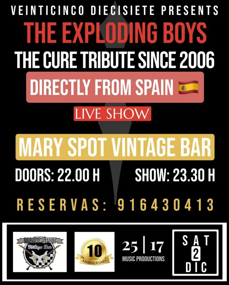 THE EXPLODING BOYS (The Cure Live Show Since 2006) oferece um elaborado show de tributo ao The Cure, com uma instrumentação adaptada para o projeto e seus muitos seguidores. Um espectáculo com identidade própria que plasmam à perfeição nos seus poderosos directos contando músicos profissionais. Uma viagem aos anos 80 que você nem pode perder.