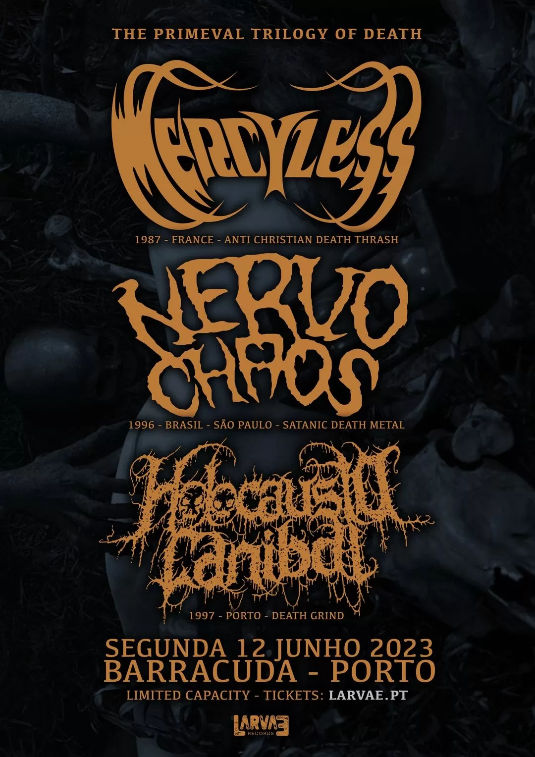 The Primeval Trilogy of Death – MERCYLESS + NERVOCHAOS + HOLOCAUSTO CANIBAL – Porto