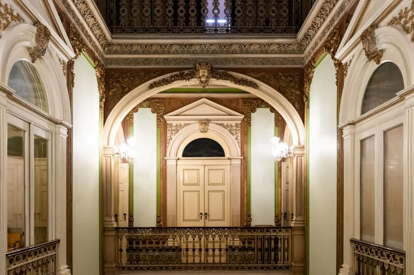 Exploração dos frescos e ornamentações do palacete, refletindo modernidade e requinte romântico