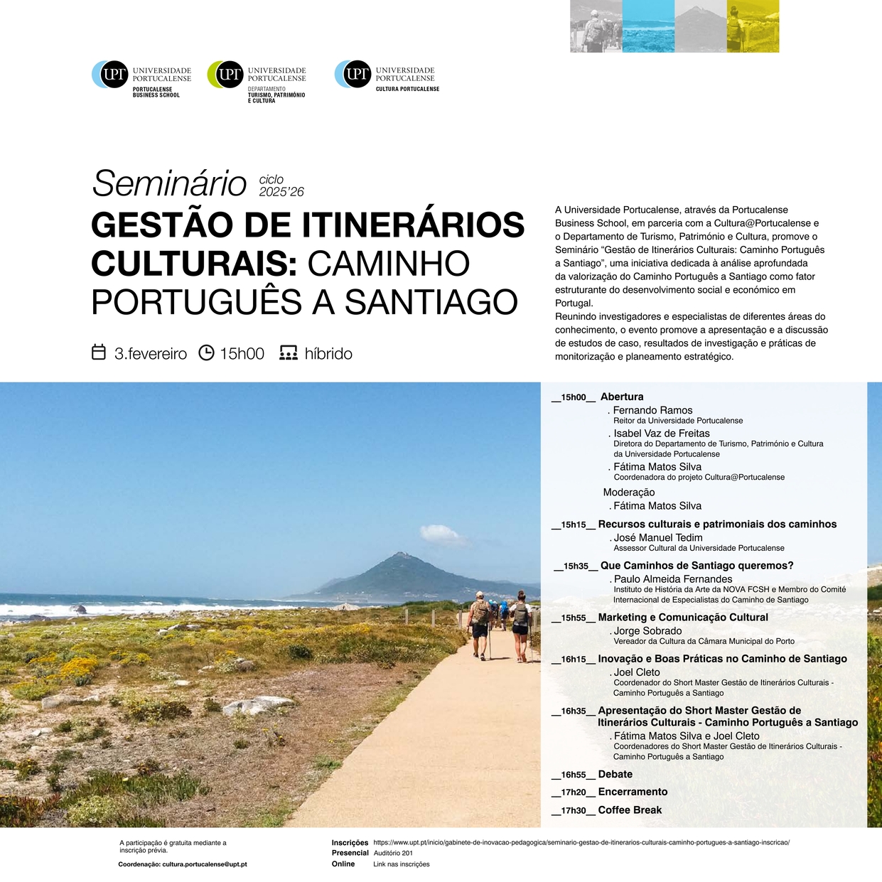 Para apresentar esta formação e debater a valorização deste itinerário histórico, a Universidade Portucalense irá promover o Seminário “Gestão de Itinerários Culturais – Caminho Português a Santiago”, no próximo dia 3 de fevereiro, às 15h.