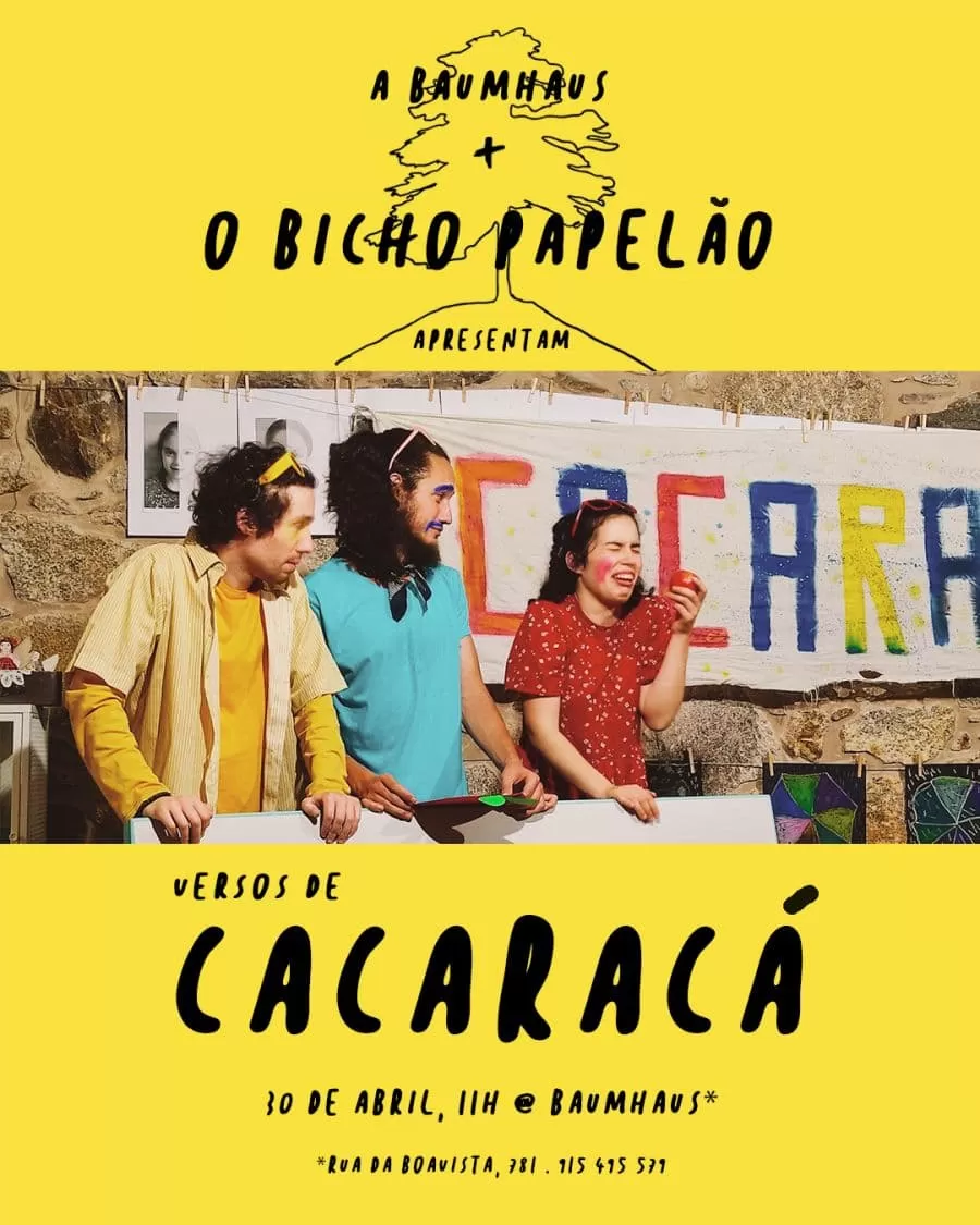 O Bicho Papelão, é um trio extraordinário que dá vida aos livros e desperta a paixão pela leitura nas crianças. Composto por três talentosos jovens com formação em teatro, música e escrita, a Inês, o Tomé e o Tó Zé, o Trio Contador de Histórias sabe muito bem como conquistar a atenção do público mais jovem com suas divertidas e envolventes performances de contos intemporais. Com o Trio Contador de Histórias, as crianças serão transportadas para um mundo de maravilha e imaginação, onde será plantada a alegria da leitura! No dia 30 de Abril, o jardim da Baumhaus vai receber o Trio, com a peça “Versos de Cacaracá”, de António Manuel Couto Viana.* “O Bicho Papelão é um Bicho mas também tem os seus medos. E não é que a poesia é o maior deles todos? Afinal, quem é que se entende entre versos, metáforas, rimas difíceis e ideias bonitas em forma de palavras complicadas? “Versos de Cacaracá” é a bandeira colorida da poesia infantil! Neste espetáculo de teatro, música e palhaçada, vamos passar umas férias a Cacaracá e brincamos às estações do ano, aos dias da semana, às cores e às estranhezas do mundo animal. Há mares de conceitos, perguntas sem respostas e conversas sobre quem somos e o que nos torna únicos. Na verdade, é tudo uma grande confusão… Mas não o é qualquer brincadeira de crianças?! Cheia de vontades incongruentes e mudanças de última hora?! Vai-se a ver e, quem sabe, não terminamos este espetáculo com uma plateia de pequenos grandes poetas diante de nós.”