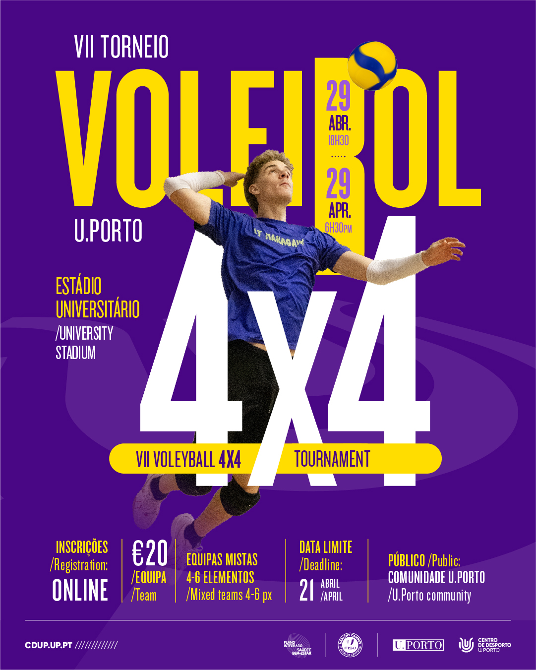 O Centro de Desporto da Universidade do Porto (CDUP-UP) vai organizar, no dia 29 de abril, a sétima edição do Torneio de Voleibol 4×4 da U.Porto. A iniciativa realiza-se no Estádio Universitário do Porto e começa às 18h30. Destina-se a estudantes, docentes, não-docentes, funcionários, investigadores e alumni. As equipas devem ser mistas e podem ter entre quatro e seis elementos. A inscrição tem um custo de 20 euros por equipa. Os interessados devem inscrever-se online, através de formulário, entre os dias 1 de abril e até ao dia 21 de abril.
