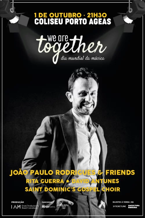 No dia em que se celebra o “Dia Mundial da Música”, a I AM Event Production & Brand Consultancy e João Paulo Rodrigues entram em cena no Coliseu do Porto Ageas para um espetáculo musical que lança os primeiros originais do humorista, apresentador e cantor. WE ARE Together com João Paulo Rodrigues & friends.