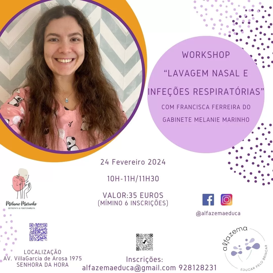 🤧👃🏼🫁Numa fantástica parceria com o gabinete da maravilhosa Fisioterapeuta Mélanie Marinho iremos realizar um workshop teórico com componente prática,onde a Fisioterapeuta Francisca Ferreira nos mostrará na prática como realizar na prática uma lavagem nasal. Venham descobrir estratégias para facilitar este momento e aprender a fazer a lavagem nasal de forma correta. Tragam as vossas seringas e venham experimentar….e não se preocupem com o soro…o Gabinete Melanie Marinho oferece!!🫁👃🏼🤧
