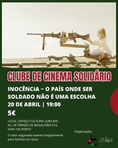 Clube de Cinema Solidário | PORTO A terceira sessão deste clube irá realizar-se no dia 20 de Abril, às 19h00, no Espaço Cultural Jubilant. Nesta