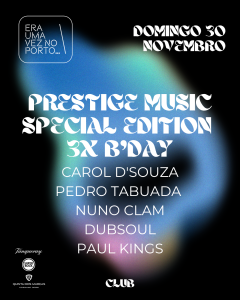 … Domingo, 30/11/2025 Prestige Music presents: SPECIAL EDITION 3X B’DAY 🎧 Carol D’Souza 🎧 Pedro Tabuada 🎧 Nuno Clam 🎧 Dubsoul 🎧 Paul Kings .